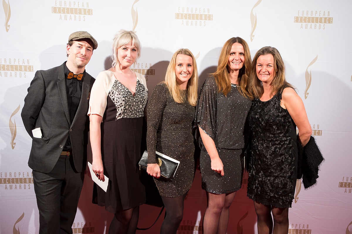 Fünf Personen in eleganter Kleidung posieren vor einer Wand mit dem Schriftzug "European Excellence Awards".
