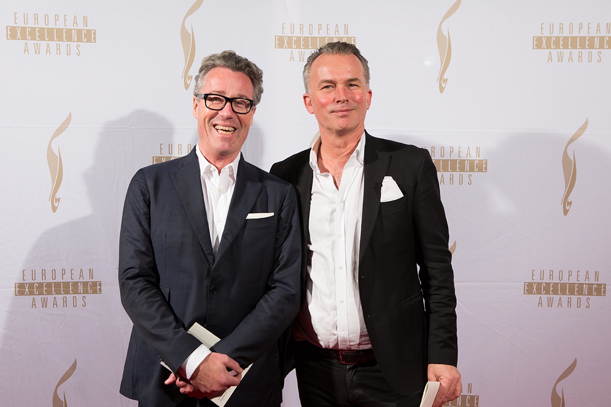 Zwei Männer in Anzügen lächeln vor einer Wand mit dem Schriftzug "European Excellence Awards".