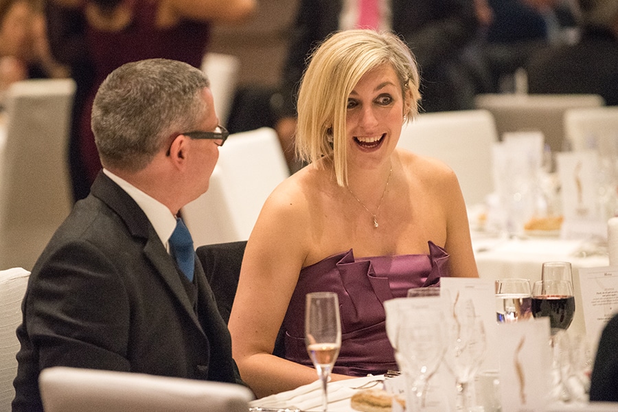 Zwei Personen an einem elegant gedeckten Tisch, eine Frau in lila Kleid lächelt, während ein Mann sie ansieht.