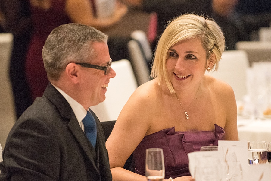 Ein Mann in einem Anzug und eine Frau in einem lila Kleid lächeln sich bei einer Gala an. Tische im Hintergrund.
