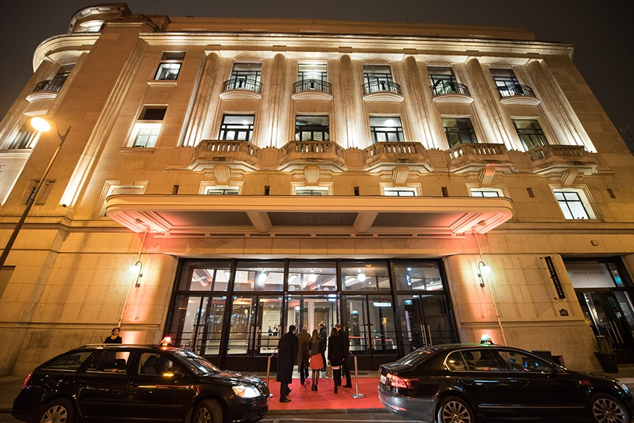 Beleuchtetes Gebäude mit Eingang, umgeben von Autos und Menschen, bei Nacht während des European Excellence Award 2014 i...