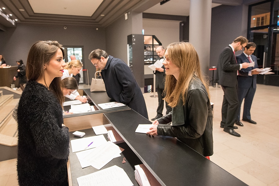 Zwei Frauen am Empfang, während Gäste im Hintergrund mit Unterlagen beschäftigt sind, bei der Verleihung des European E...