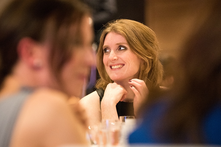 Lächelnde Frau in eleganter Kleidung, umgeben von anderen Gästen bei einer Gala-Veranstaltung.