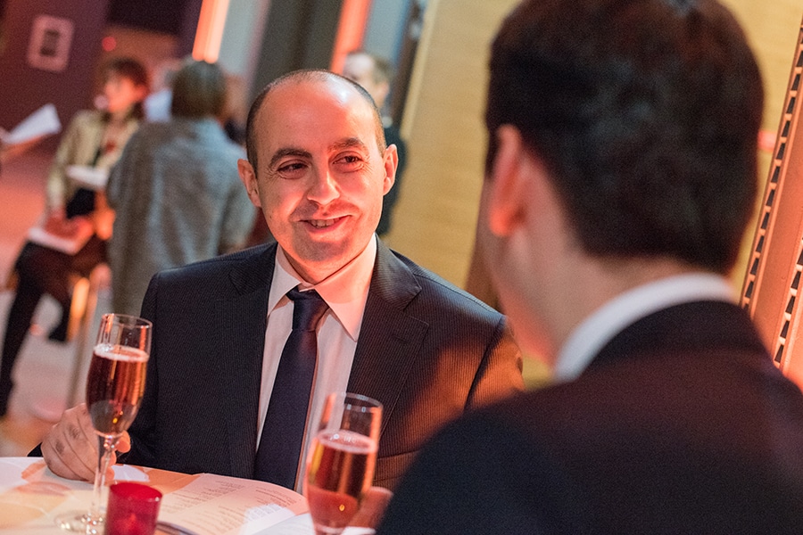 Zwei Männer in Anzügen unterhalten sich bei einem Event, jeweils mit einem Sektglas in der Hand.