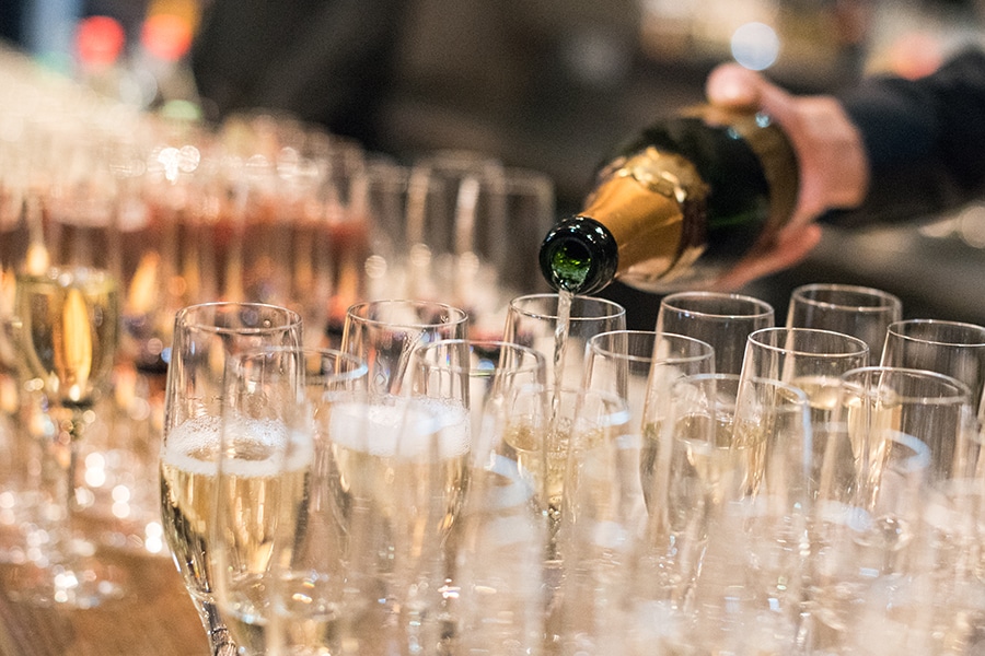 Sektflasche wird in Gläser gefüllt, die auf einem Tisch stehen, im Hintergrund verschwommene Getränke und festliche Atm...