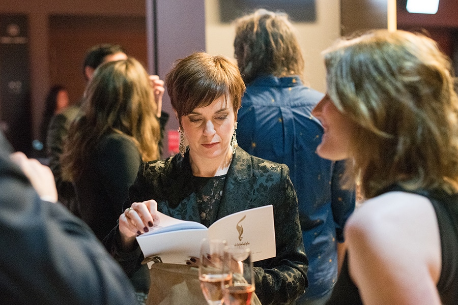 Frau mit kurzen braunen Haaren liest in einem Programmheft, umgeben von anderen Gästen bei der European Excellence Award ...