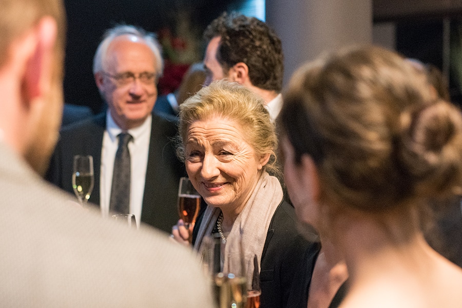 Menschen in formeller Kleidung bei einer Feier, mit Sektgläsern, lächelnde Frau im Vordergrund.