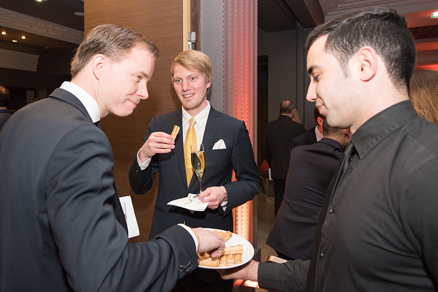 Drei Männer in formeller Kleidung stehen bei einer Veranstaltung, einer hält ein Tablett mit Snacks, ein anderer ein Gla...