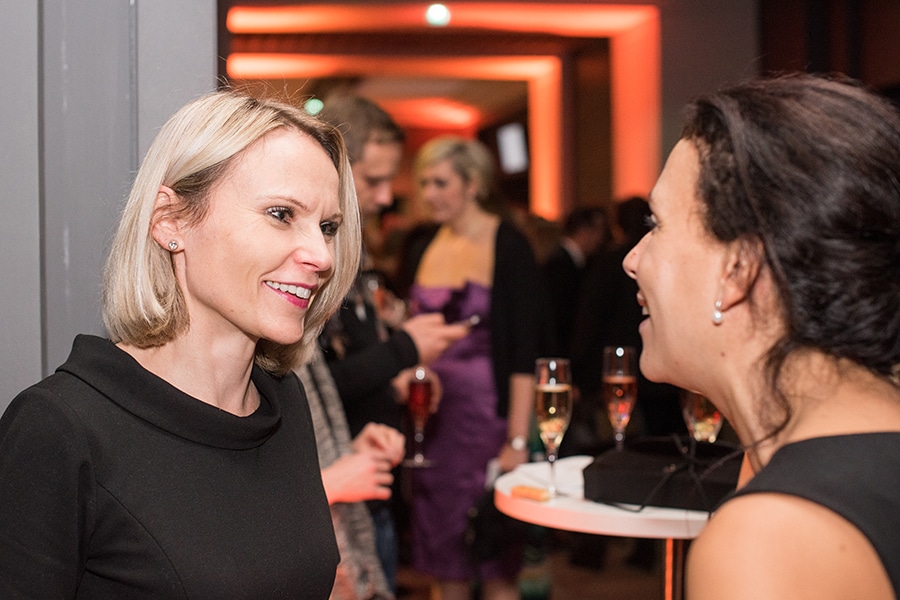 Zwei Frauen in eleganter Kleidung unterhalten sich bei einer festlichen Veranstaltung, im Hintergrund sind Gäste und Getr...