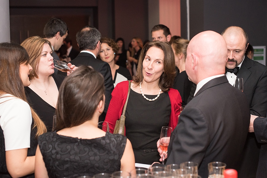 Personen in eleganter Abendkleidung unterhalten sich bei der European Excellence Award 2014 Feier in Paris.