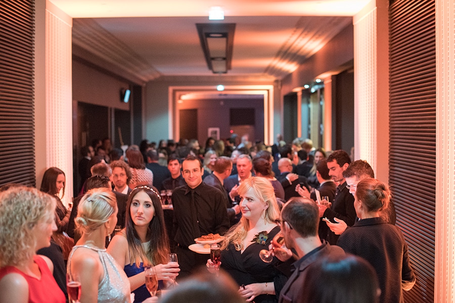 Menschenmenge bei der European Excellence Award 2014 Feier in Paris, mit Gästen in eleganter Kleidung und Getränken.