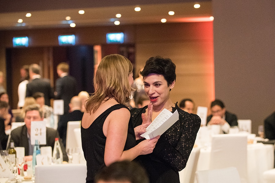 Zwei Frauen in eleganter Kleidung unterhalten sich bei einer Gala, umgeben von festlich gedeckten Tischen.