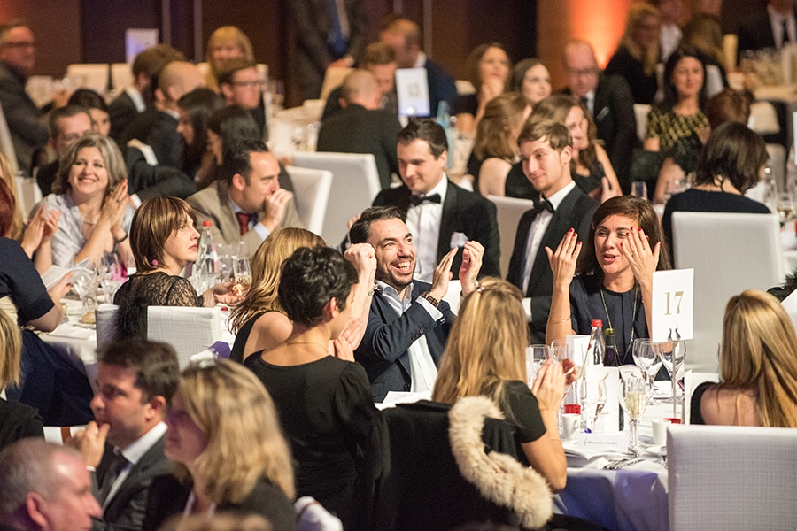 Menschen applaudieren und feiern bei der European Excellence Award Gala 2014 in Paris, elegant gekleidet.