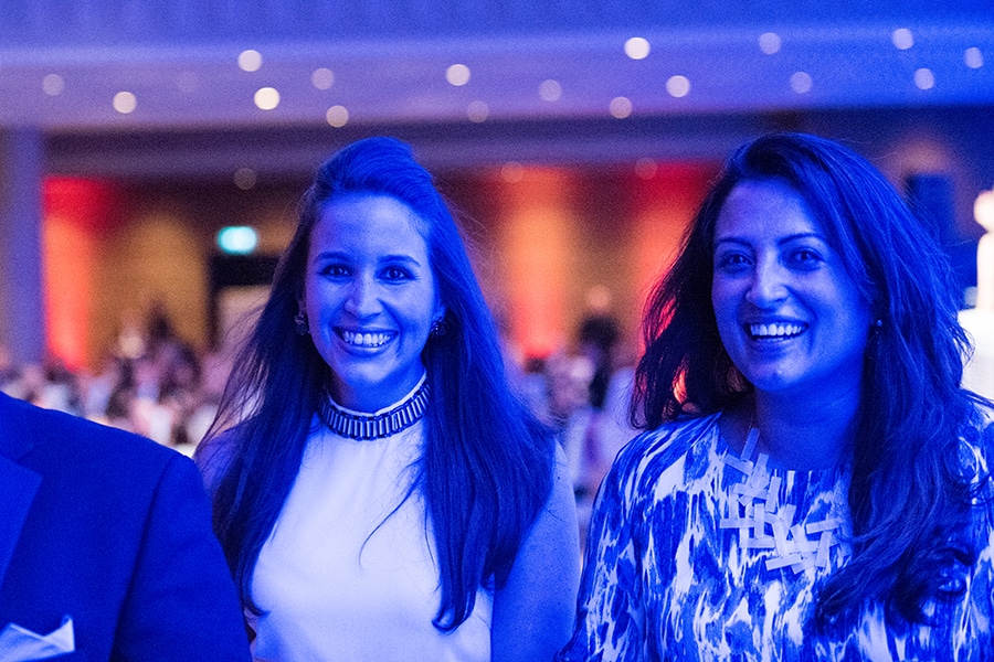 Zwei Frauen lächeln in einem festlichen, blau beleuchteten Raum während der European Excellence Award Gala 2014.