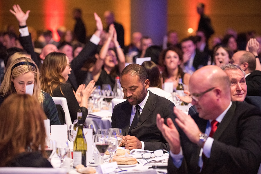 Menschen in formeller Kleidung sitzen an Tischen, applaudieren und feiern bei der European Excellence Award Gala 2014 in P...