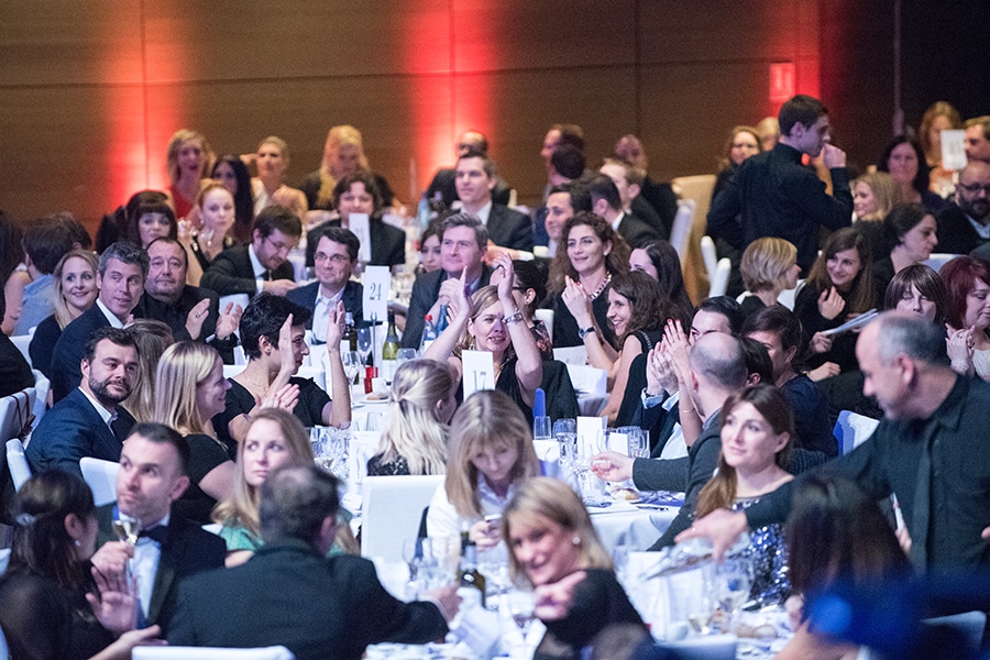 Gala-Veranstaltung mit applaudierenden Gästen in eleganter Abendkleidung, festlich dekoriertem Raum und Tischgedecken.