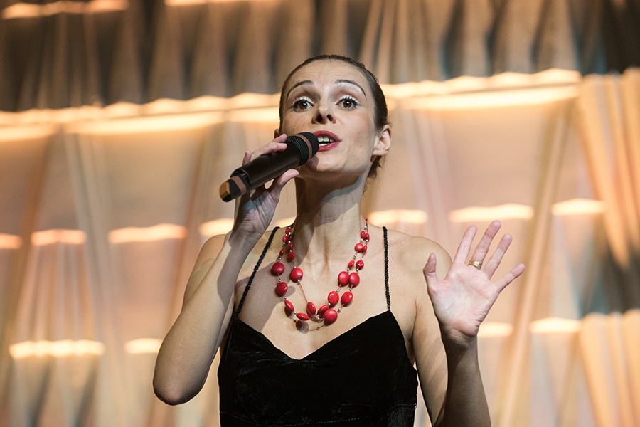Frau mit Mikrofon singt auf einer Gala, trägt ein schwarzes Kleid und eine auffällige rote Halskette.