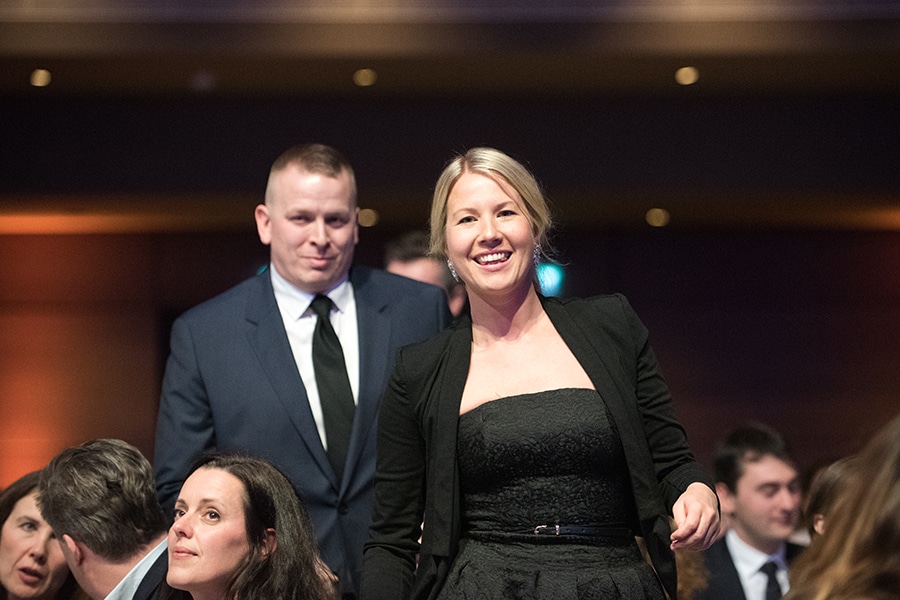 Frau in schwarzem Kleid lächelt, während sie auf einer Gala aufsteht; Männer und Frauen im Hintergrund.