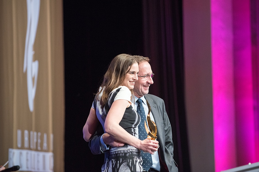 Zwei Personen auf einer Bühne umarmen sich, während eine von ihnen einen Preis hält. Im Hintergrund sind dekorative Ele...