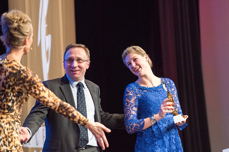 Zwei Personen auf einer Bühne, eine Frau in blauer Spitze hält einen Preis, während ein Mann lächelt und gestikuliert.