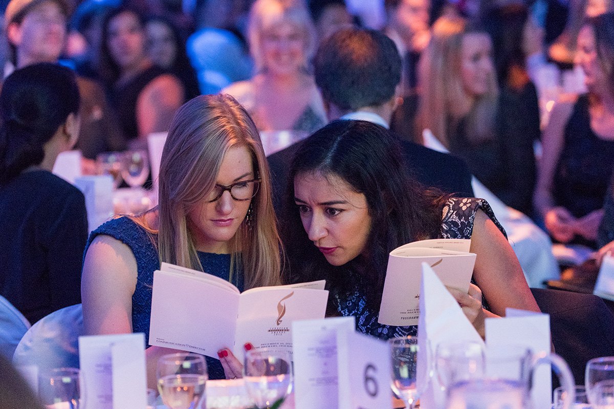 Zwei Frauen in eleganter Kleidung lesen konzentriert in einem Programmheft während einer Gala. Hintergrund mit Gästen un...