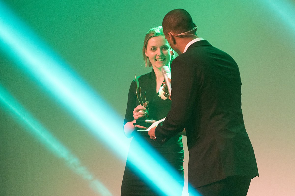 Eine Frau erhält einen Preis von einem Mann auf einer Gala mit grünem Licht und festlicher Atmosphäre.