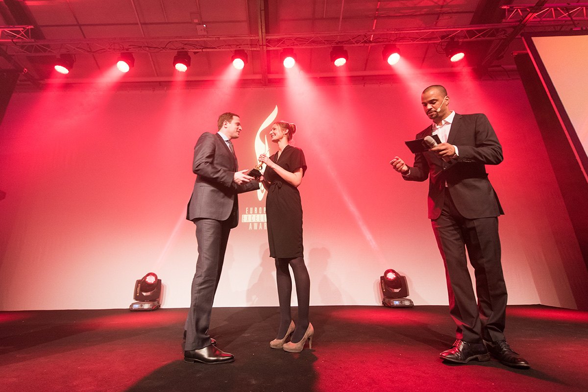 Zwei Personen auf der Bühne bei der Gala der European Excellence Awards 2015, beleuchtet von roten Scheinwerfern.