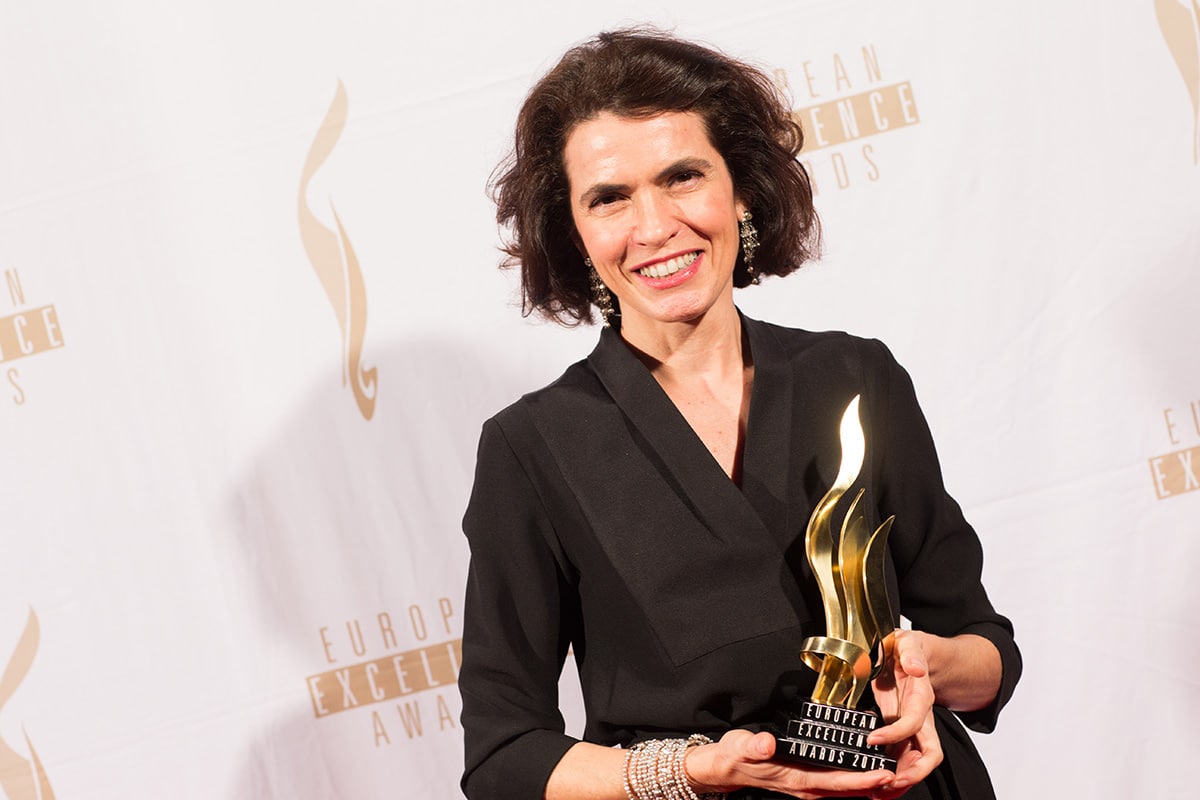 Frau in schwarzem Kleid hält einen goldenen Preis, lächelt vor einem Banner der European Excellence Awards.