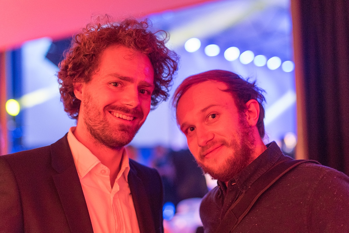 Zwei Männer in formeller Kleidung lächeln in die Kamera, im Hintergrund sind bunte Lichter einer Gala zu sehen.