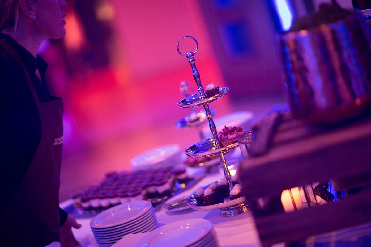 Tisch mit festlicher Dekoration, Platten voller Süßigkeiten und einer Person im Hintergrund bei der Gala der European Ex...