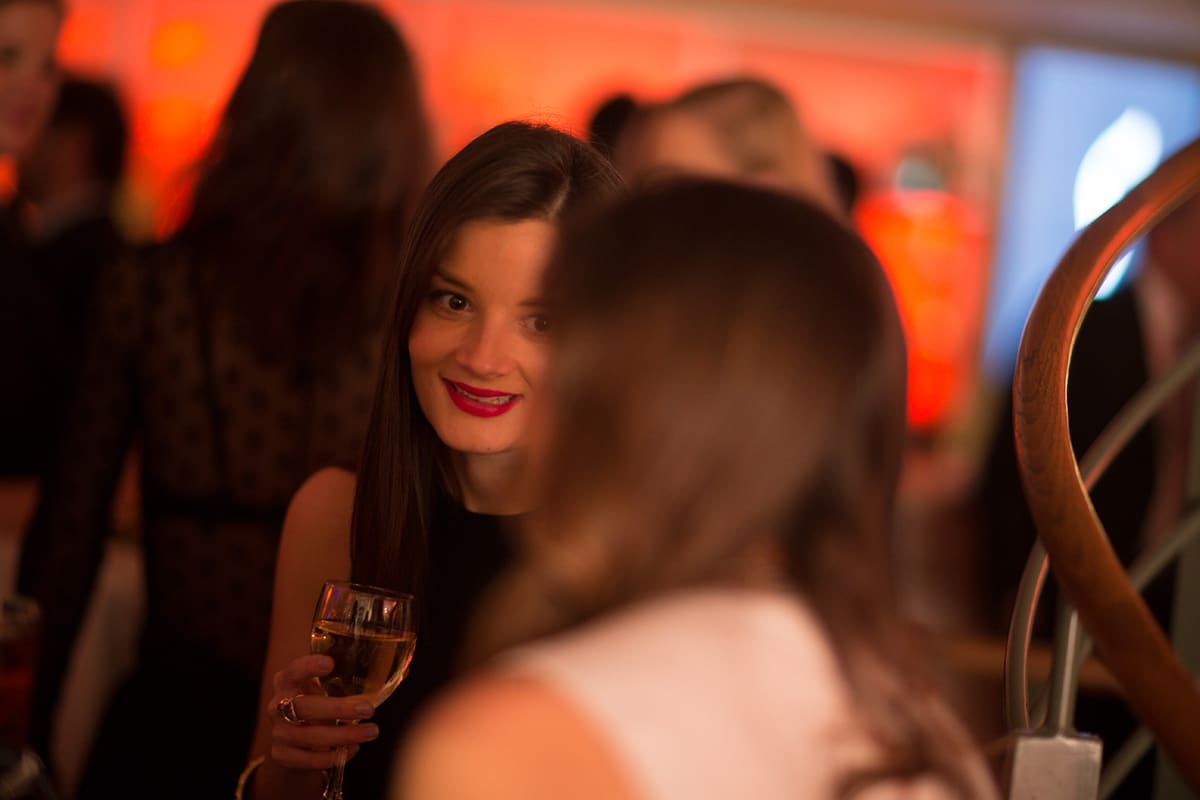 Frau mit rotem Lippenstift hält ein Glas Sekt, lächelt in eine festliche Gala-Umgebung mit verschwommenen Gästen.