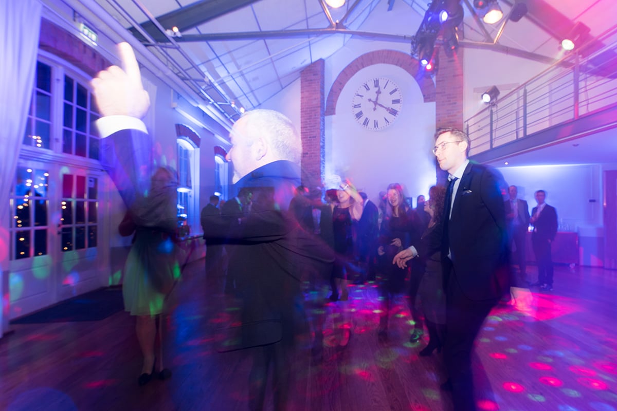 Tanzende Gäste in festlicher Kleidung bei der European Excellence Awards Gala 2015, mit bunten Lichtern und einer Uhr im ...
