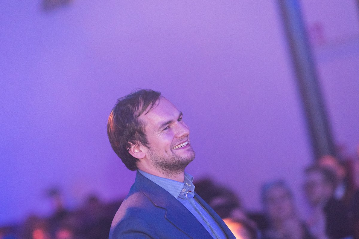 Lächelnder Mann in Anzug bei der European Excellence Awards Gala 2015 in Stockholm, mit lila Beleuchtung im Hintergrund.
