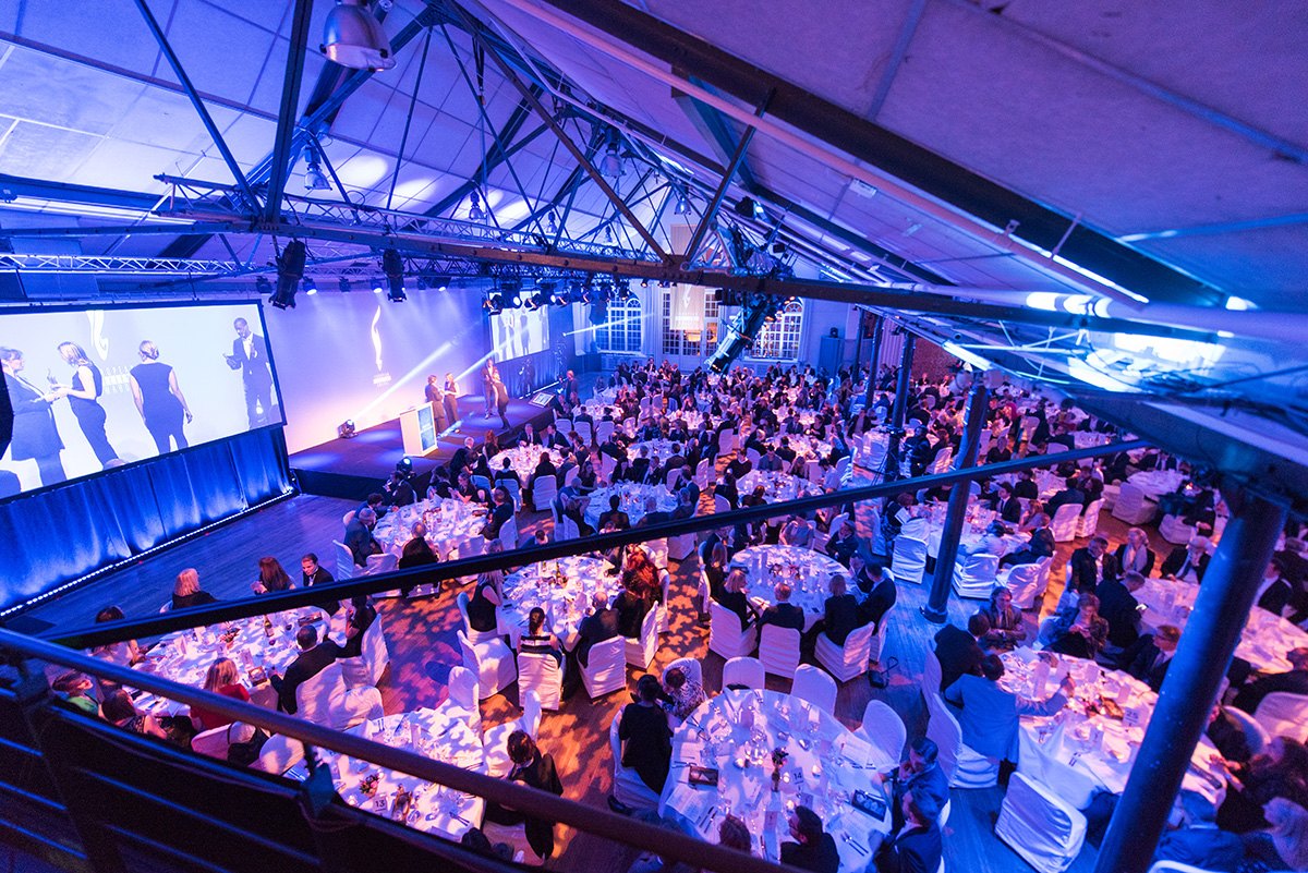 Gala-Event mit vielen Gästen in einem festlich dekorierten Raum, Bühnenpräsentation im Hintergrund.