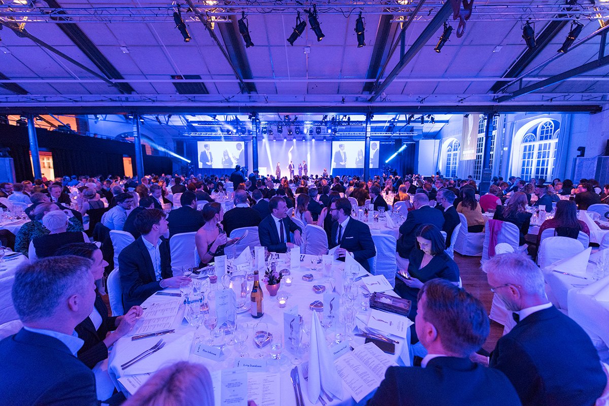 Gala-Event mit vielen Gästen in eleganter Kleidung, Bühne mit Präsentation und festlich gedeckten Tischen.
