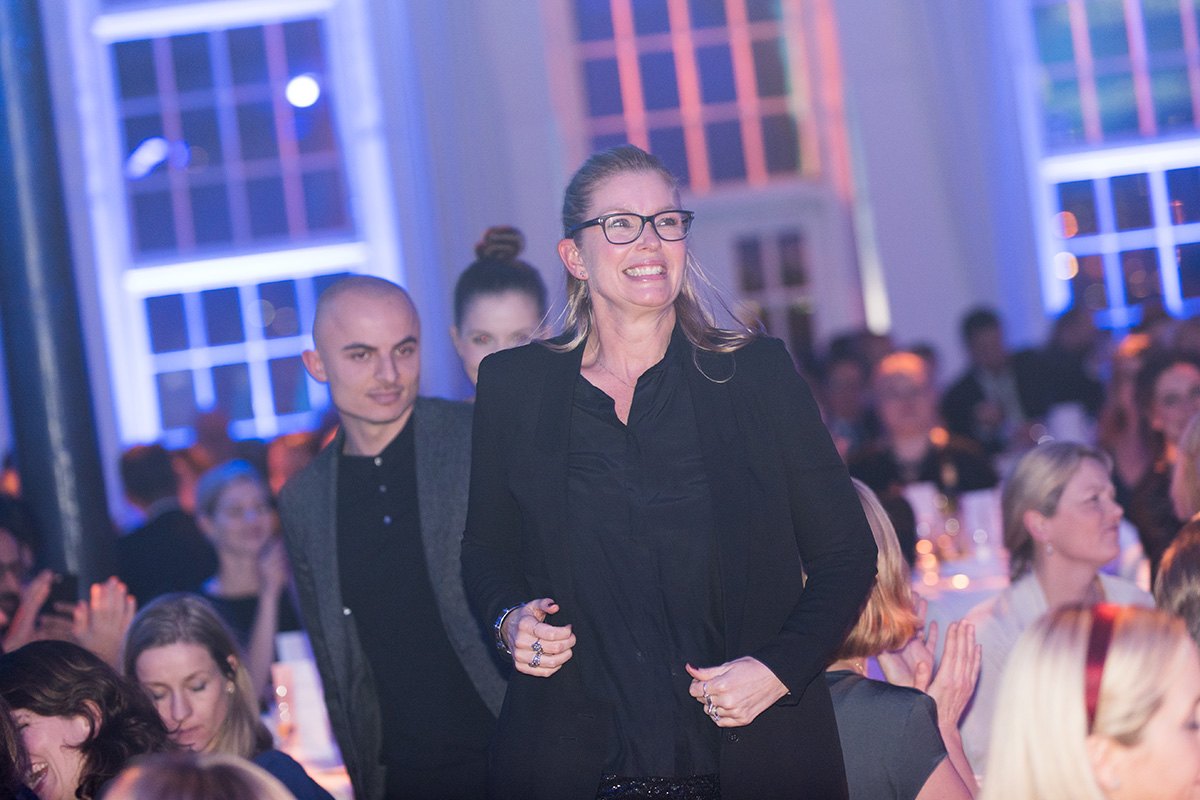 Frau mit Brille in schwarzer Kleidung steht lächelnd in einer Gala, umgeben von applaudierenden Gästen.