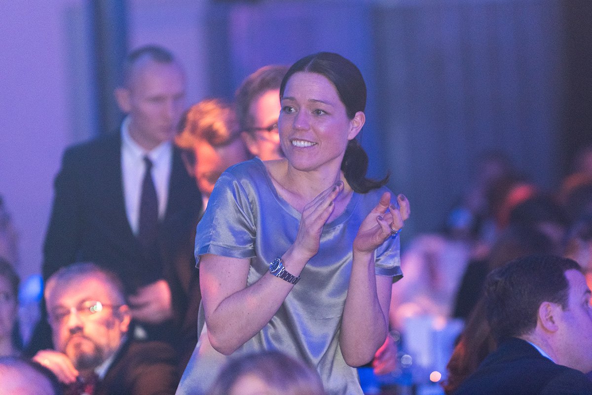 Frau in silbernem Kleid applaudiert bei der Gala der European Excellence Awards 2015 in Stockholm.