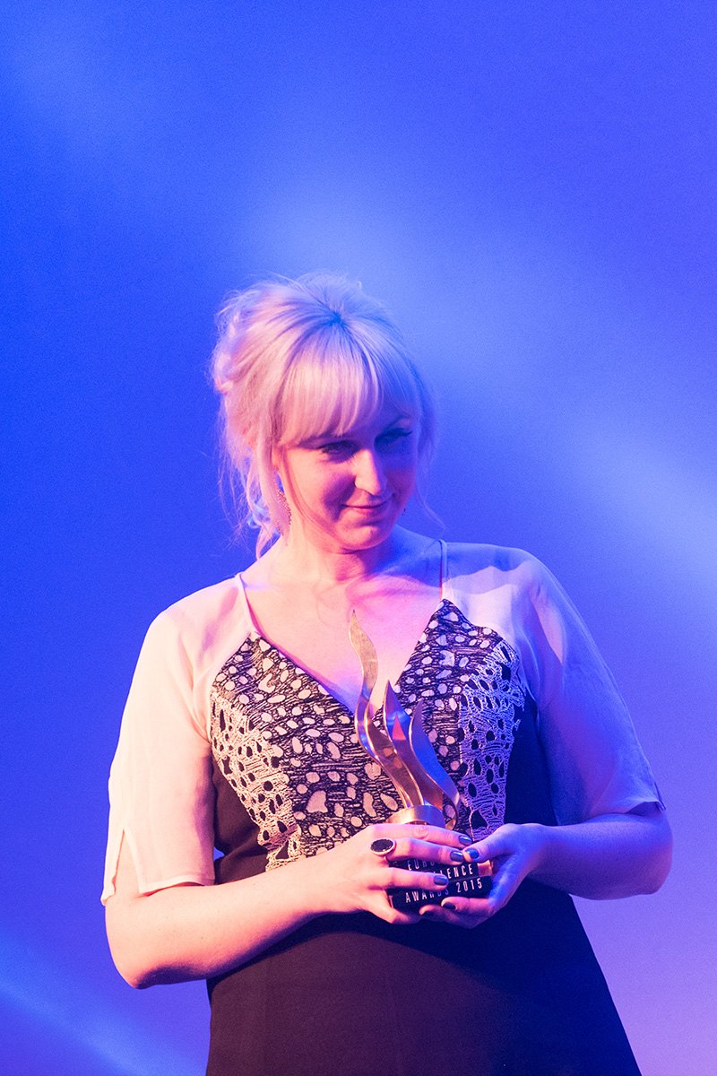 Frau mit blonden Haaren hält einen Preis in einer Gala-Umgebung mit blauem Licht.
