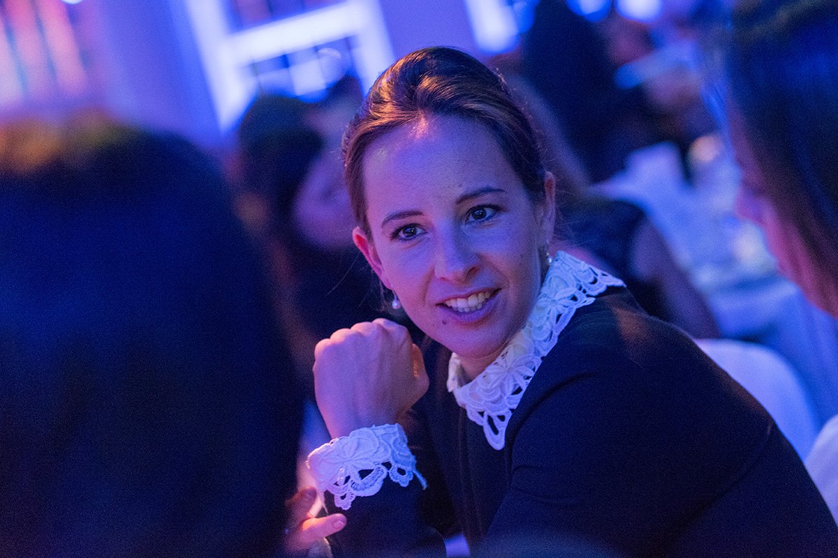 Frau mit blonder Haarfarbe und Spitzenkragen, lächelt während einer Gala in einem festlich beleuchteten Raum.