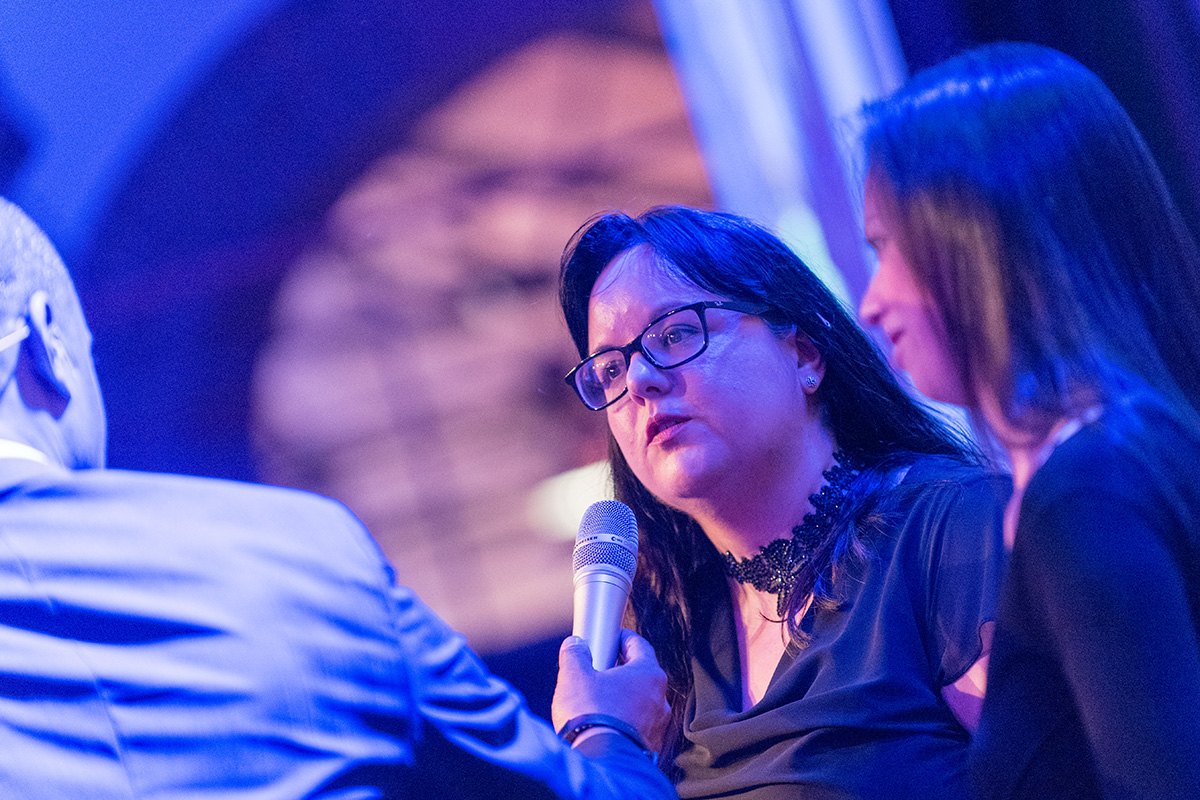Zwei Frauen in eleganter Kleidung sitzen auf einer Bühne, während ein Mann mit Mikrofon spricht. Bläuliches Licht beleu...