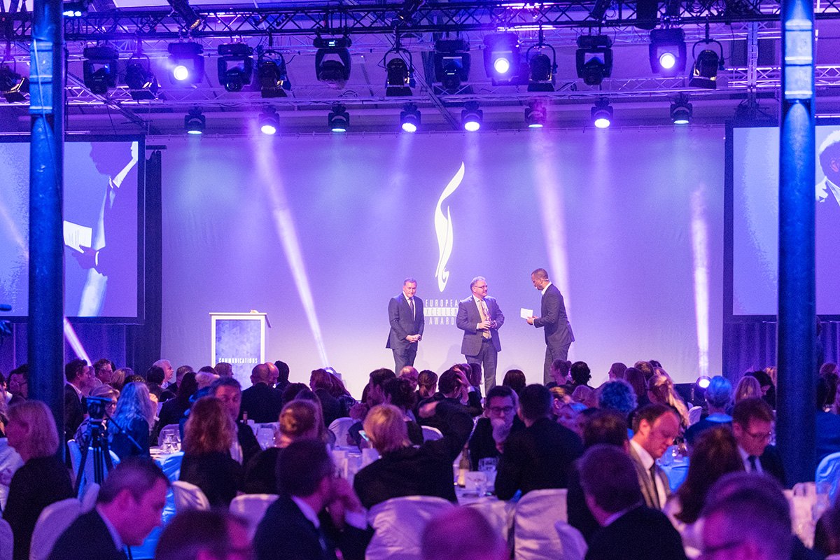Gala-Event mit Gästen an Tischen, auf der Bühne stehen drei Personen vor einer beleuchteten Kulisse.