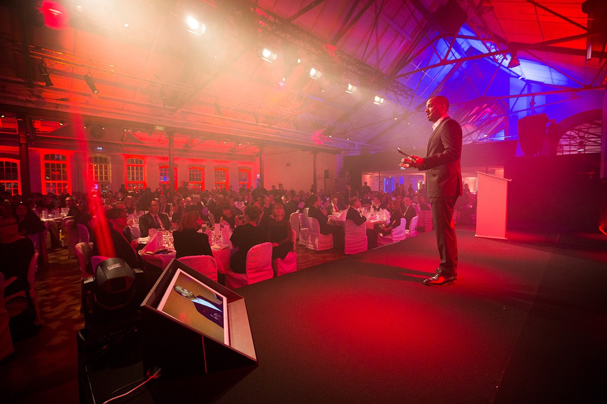 Gala-Event mit einem Redner auf der Bühne, beleuchtet von rotem und blauem Licht, umgeben von Gästen an Tischen.