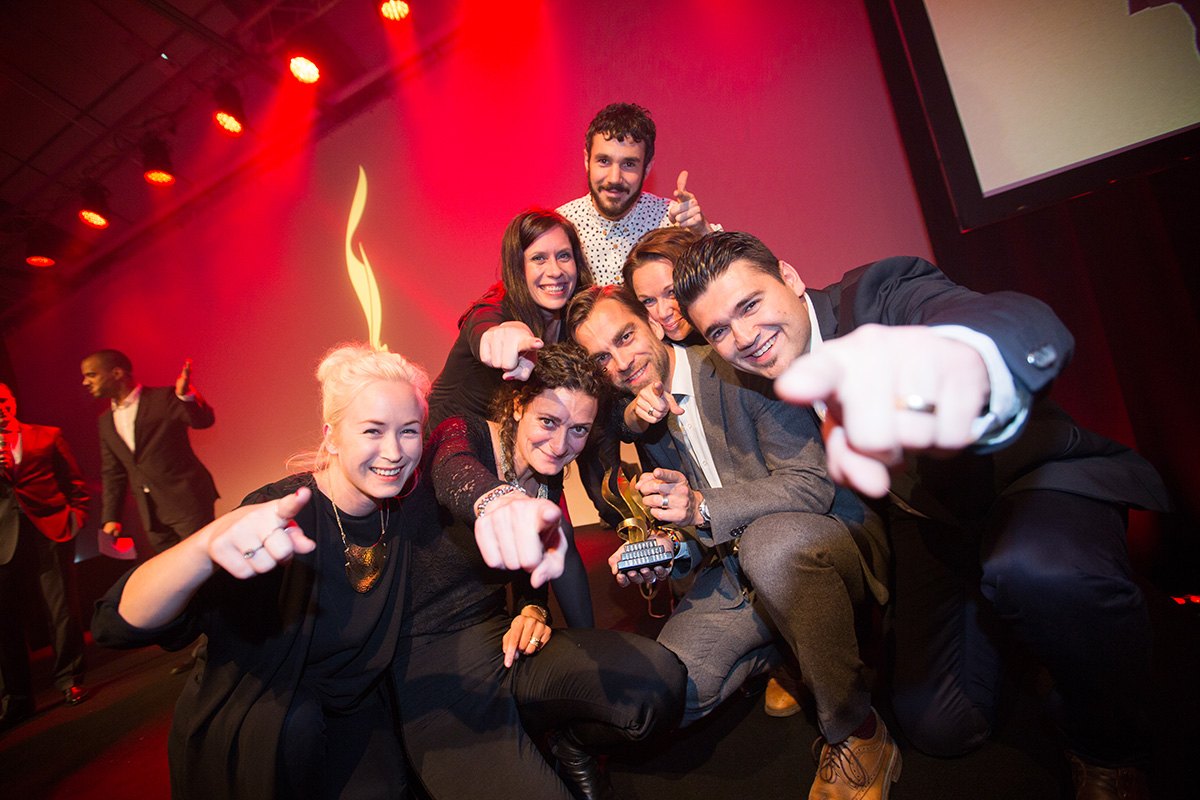Gruppe von sieben Personen posiert auf einer Gala, hält einen Preis und zeigt mit dem Finger in die Kamera. Rote Beleucht...