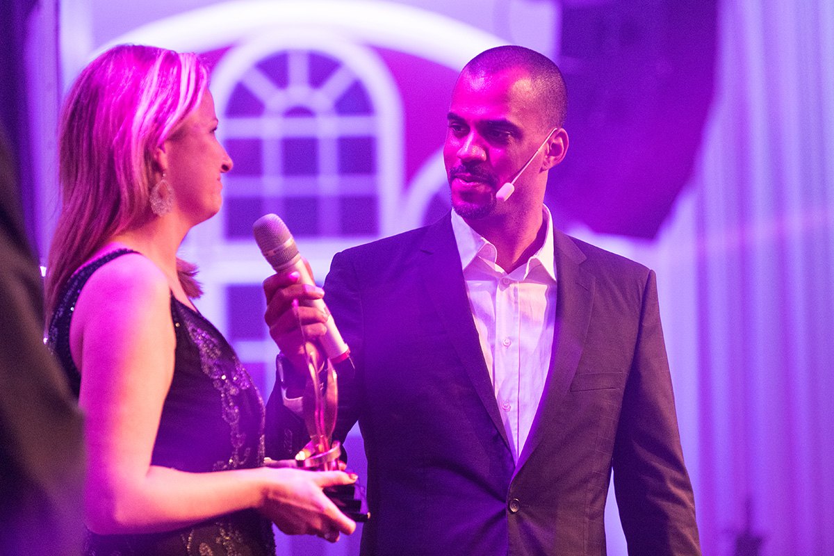 Zwei Personen auf einer Gala-Bühne, eine Frau mit Mikrofon und Preis, ein Mann in Anzug, lila Beleuchtung im Hintergrund.