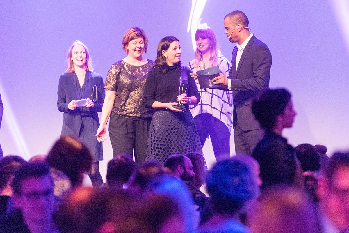 Vier Personen auf einer Bühne bei der Gala der European Excellence Awards 2015 in Stockholm, Publikum im Hintergrund.