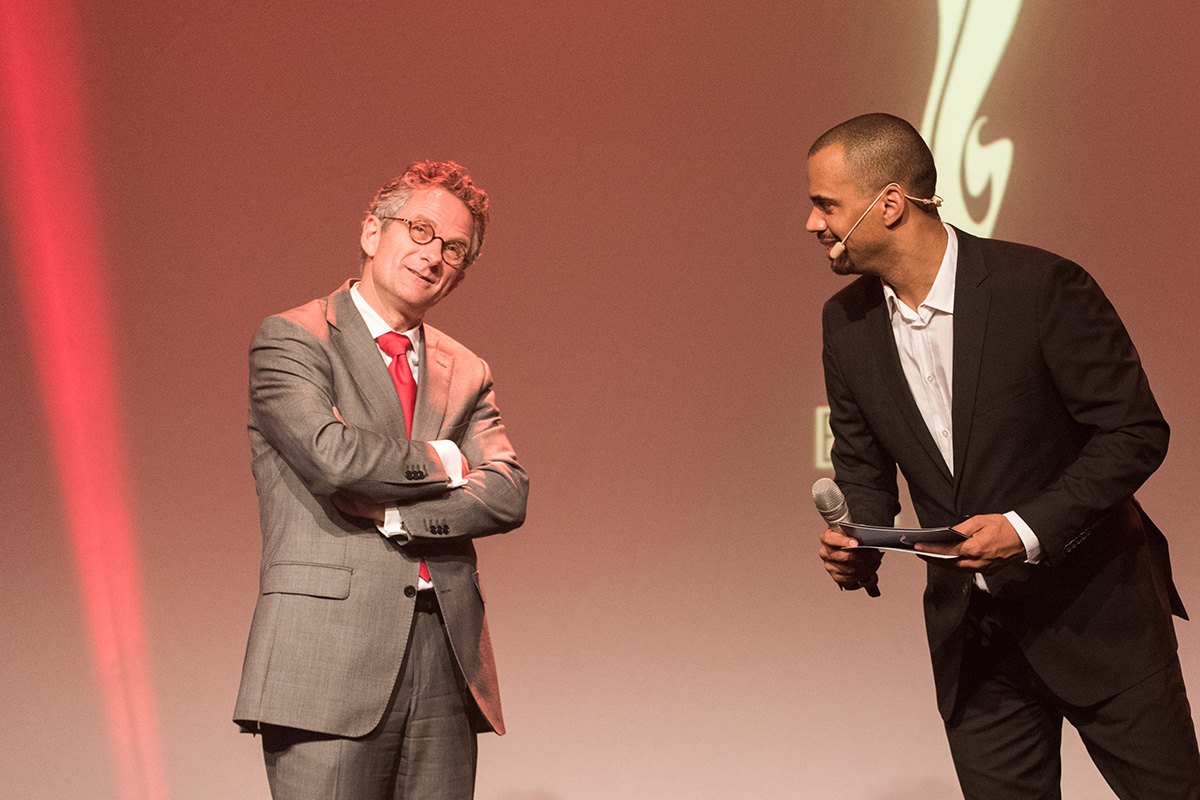 Zwei Männer auf einer Gala-Bühne, einer im Anzug mit Brille, der andere im schwarzen Outfit, beide im Gespräch.