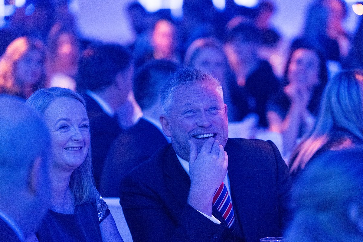 Lächelnde Gäste bei der European Excellence Awards Gala 2015 in Stockholm, mit blauer Beleuchtung im Hintergrund.