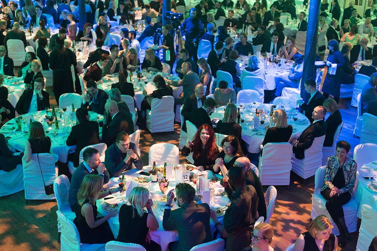Gala-Event mit zahlreichen Gästen an festlich gedeckten Tischen in einem beleuchteten Saal.