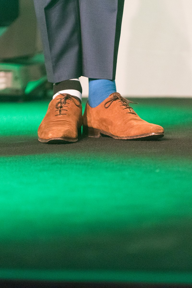 Braune Schuhe mit unterschiedlichen Socken: eine schwarz-weiße Socke und eine blaue Socke auf grünem Bühnenboden.