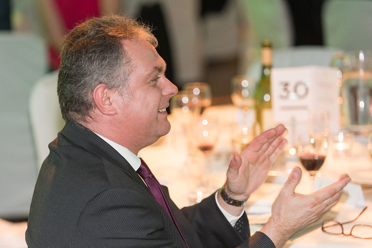 Mann in Anzug mit lächelndem Gesicht, der applaudiert, umgeben von gedeckten Tischen bei einer Gala.